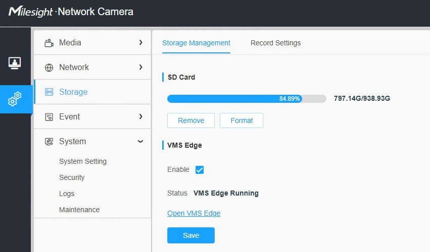 Navigate to Settings - Storage - Storage Management. Please ensure that you insert and format the SD card. After enabling VMS Edge, the status will change to 'VMS Edge Running', indicating that the Nx Server is enabled.